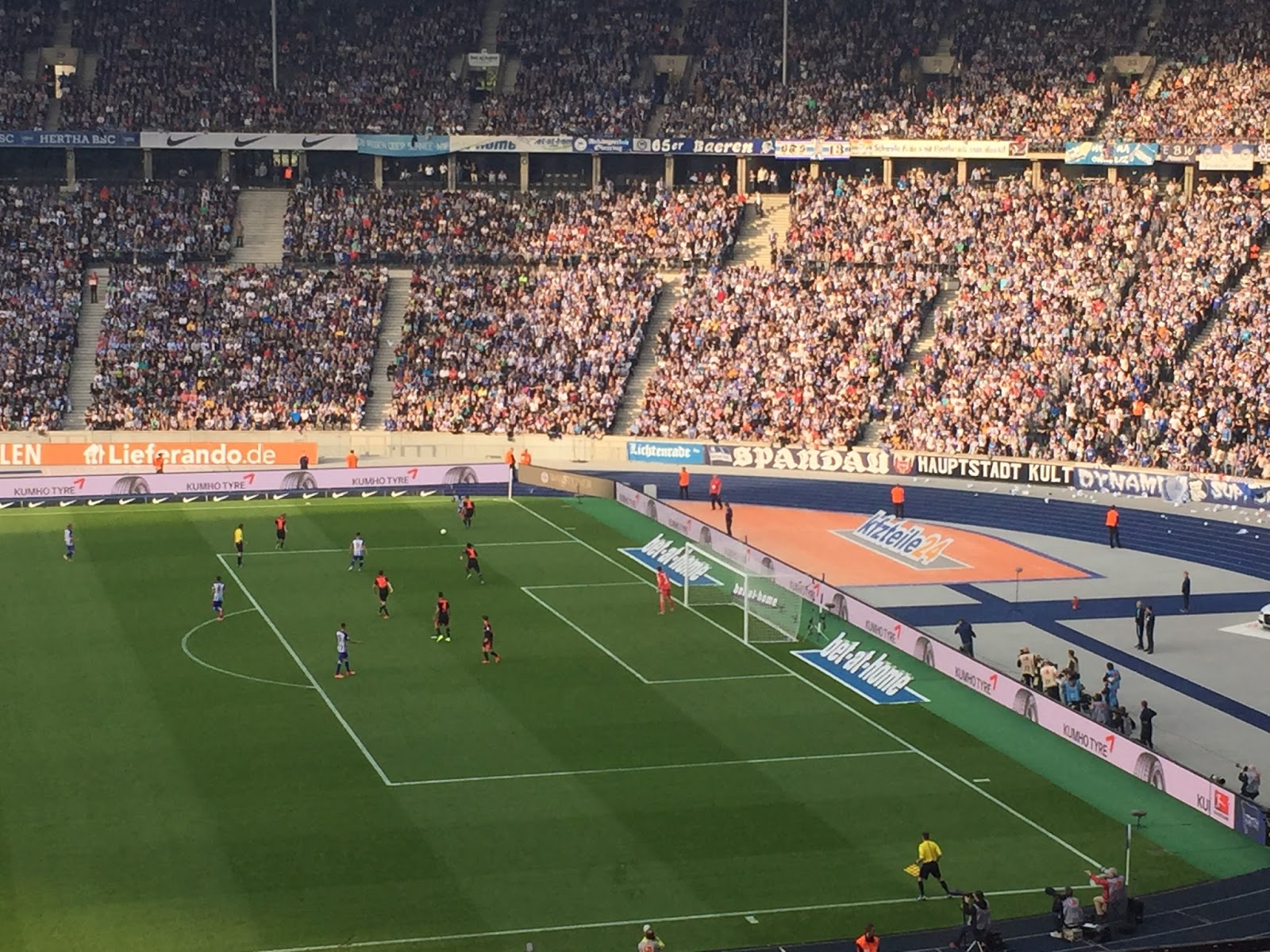Totalt var vi litt over 65000 på denne kampen, deriblant en solid kontingent fra Hamburg, som spesielt tidlig i kampen ga mye lyd fra seg. Ved innmarsjen kjørte Hertha-supporterne en imponerende tifo som i anledning gjenforeningsjubileumsdagen var basert på gjenforeningen av de to delene av Berlin, og at Hertha er laget for hele byen.