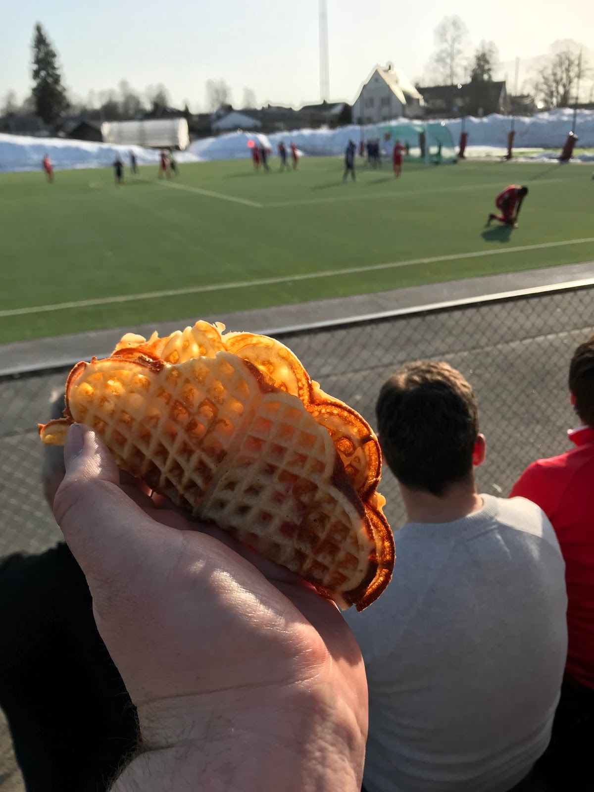 Resten av første omgang ble både fartsfylt og jevnspilt, men svært sjansefattig. Da det ble pause fikk jeg testa de lokale vaflene, som ble solgt til en svært hyggelig pris, men manglet et eller annet (sannsynligvis litt mer smør i røra) for å nå helt til topps på smaksskalaen.